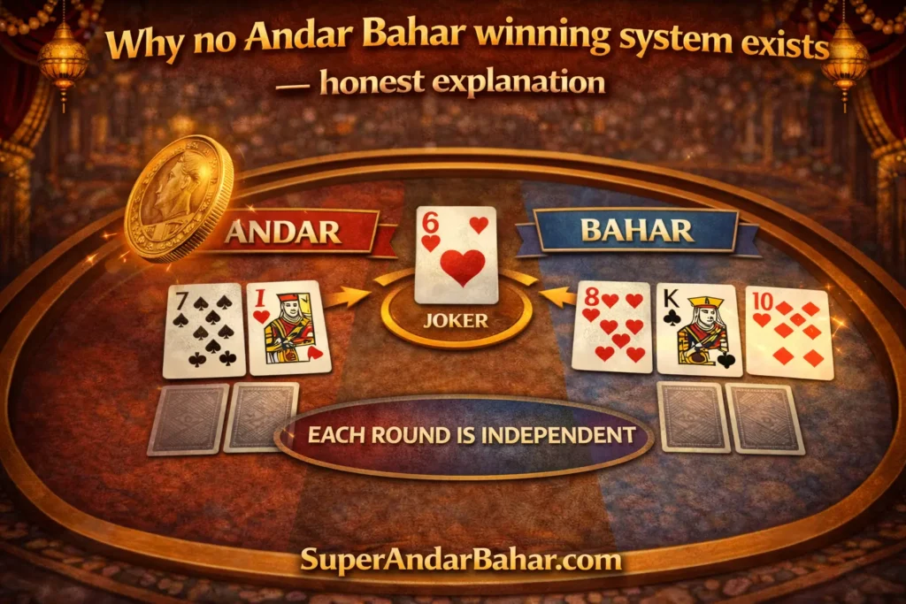 Andar Bahar is a 50/50 game. You pick Andar or Bahar. A card either matches on your side or it does not. No pattern in the dealing history predicts the next round. No app can tell you which side will win. No betting sequence turns a losing session into a winning one.